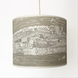 Inspired by holidays in Fowey in Cornwall, escape to the seaside with this beautiful, detailed design. Cottages, waves, little boats and the hills beyond are all evoked here. Would look perfect in coastal style room, as a central pendant or on a small standard lamp. See also our matching Dolphin Cushion.
