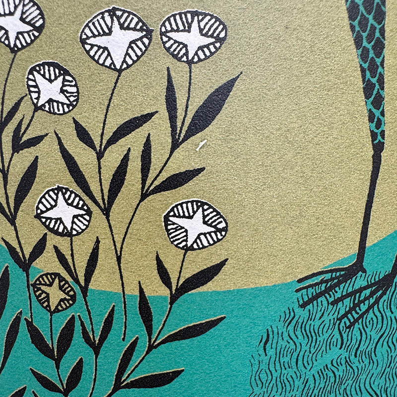 This print features an elegant garden with classical water-features populated by leggy Secretary Birds. There's a teeny mark in the print (see detail photo) but it doesn't spoil its good looks and its a bargain!