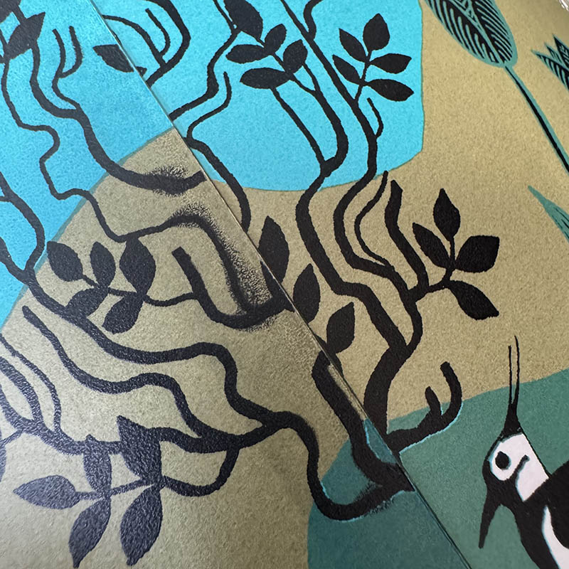 This print features an elegant garden with classical water-features populated by leggy Secretary Birds. There's a faint smudge in the print bay the seam(see detail photo) but it doesn't spoil its good looks and its a bargain!