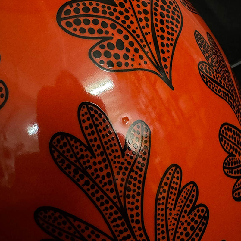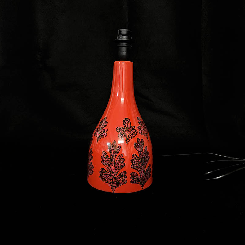 These lamp bases are made from ceramic decorated with beautifully drawn plants and this one has our vibrant orange-red glaze colour. Its a second because of a small fault in the glaze (see detail pic)