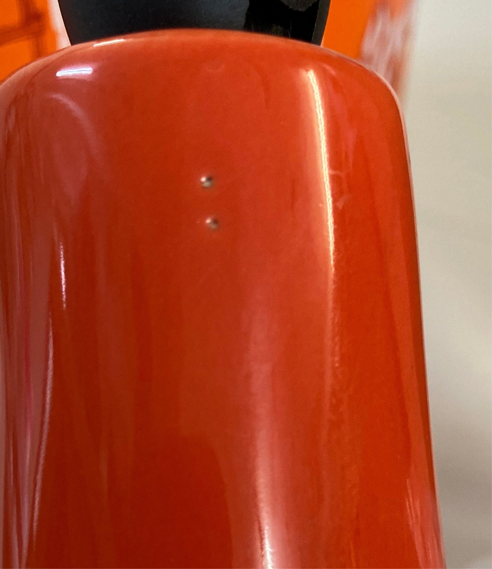 These lamp bases are made from ceramic decorated with beautifully drawn plants and this one has our vibrant orange-red glaze colour. Its a second because of a small fault in the glaze (see detail pic)